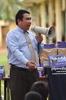 ![]() Mr. Reach Sambath speaking to students during his Khmer Rouge Tribunal outreach work | |
