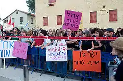 Many pro-Israeli rallies took place within the country, including by Sderot residents, in Qiryat Shmona and student rallies in the Technion, University of Haifa, Ben Gurion University, Hebrew University of Jerusalem and Tel Aviv University. The rallies included hundreds of demonstrators waving the flag of Israel and chanting slogans in support of the IDF and Shayetet 13.[77][78][79] A large and fierce protest was held in front of the Turkish embassy, which included slogans such as "Shayetet 13, we are with you," "We are all the IDF," "Cold weapons kill." Protesters also accused Turkish Prime Minister Recep Tayyip Erdoğan of "supporting terrorism" and equated him with Osama Bin-Laden and Mahmoud Ahmadinejad.[80] They also chanted, "The [Gaza] flotilla is burning," while carrying signs reading, "Ahmadinejad=Erdogan". The organizers of the embassy protest described themselves as young zionists.[81][82]