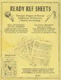Ready Ref Sheets is a supplement of GM's reference tables for such things as encounters of all sorts, character social levels, movement obstacles, wilderness terrain movement rates, magical research times, and resurrection results.[1]