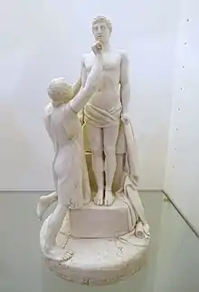 The room at the small Casita del Principe, El Escorial was again Neoclassical, but with a very different appearance. The walls were almost entirely covered by 234 plaques in the style and technique of Wedgwood's jasperware, with a "Wedgwood blue" ground and the design in white biscuit porcelain in low relief. These were applied as sprigs, meaning that they made separately as thin pieces, and stuck to the main blue body before firing. The plaques are framed like paintings; they were made between 1790 and 1795.[3]
