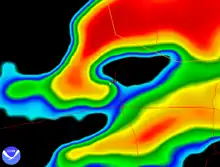 The rear flank downdraft (RFD) is a region of dry air wrapping around the back of a mesocyclone in a supercell thunderstorm.[1] These areas of descending air are thought to be essential in the production of many supercellular tornadoes. Large hail within the rear flank downdraft often shows up brightly as a hook on weather radar images, producing the characteristic hook echo, which often indicates the presence of a tornado.[1]