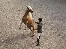 A horse that rears when being handled by a human who is on the ground also presents a hazard, as it is able to strike out with its front feet and can also fall even without the weight of a rider to unbalance the animal. A rearing horse can also break away and escape from a human handler.