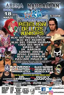 Professional wrestling has been a generational tradition in lucha libre since its inception early in the 20th century, with many second- or third-generation wrestlers following in the footsteps of their fathers or mothers.[2] Several lucha libre promotions honor those traditions, often with annual tournaments such as Consejo Mundial de Lucha Libre's La Copa Junior.[3] The Naucalpan, State of Mexico-based International Wrestling Revolution Group (IWRG) in 2011 created the IWRG Junior de Juniors Championship, a championship where only second- or third-generation wrestlers are allowed to wrestle for it. In addition to real-life second- or third-generation wrestlers there are a number of wrestlers who are presented as second- or third-generation wrestlers, normally masked wrestlers promoted as "Juniors". These wrestlers normally pay a royalty or fee for the use of the name, using the name of an established star to get attention from fans and promoters.[2] Examples of such instances of fictional family relationships include Cien Caras Jr. who paid Cien Caras for the rights to use the name.[4] In March 2011, only weeks after the creation of the Junior de Juniors Championship IWRG held their first IWRG Rebelión de los Juniors show, with the focal point being the Junior de Juniors Championship and "Junior" competitors.[5] The Rebelión de los Juniors shows, as well as the majority of the IWRG shows in general, are held in "Arena Naucalpan", owned by the promoters of IWRG and their main arena. The 2018 show was the eight year that IWRG used the Rebelión de los Juniors name and concept for a show.