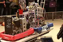 The field is a carpeted area 27 feet by 54 feet[11] designed to mimic a basketball court.[12] At both ends are the driver stations and an array of basketball hoops.[11] There is one low hoop, two middle hoops, and one high hoop.[11] Across the narrow dimension of the field a 4 inch high wall, along which are placed three tilting bridges at a height of 12 inches.[11] The bridges at the edges are color-coded for each alliance, and the center bridge, called the Coopertition bridge, is available for both alliances.[11]