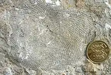 Receptaculites is the name-bearing genus for an extinct group of conspicuous benthic marine genera, the receptaculitids (formally Receptaculitaceae or Receptaculitidae), that lived from the Early Ordovician through the Permian period, peaking in the Middle Ordovician. The group's phylogenetic origin has long been obscure, with some arguing that they were calcareous algae, probably of the order Dasycladales.[3] Receptaculitids lived in warm, shallow seas,[3] but consensus disagreeing.[4][5] They have been described from all continents except Antarctica.[6][2] In some areas they were important reef-formers, and they also occur as isolated specimens.[7]