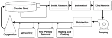 In addition to treating the liquid waste excreted by fish the solid waste must also be treated, this is done by concentrating and flushing the solids out of the system.[6] Removing solids reduces bacteria growth, oxygen demand, and the proliferation of disease. The simplest method for removing solids is the creation of settling basin where the relative velocity of the water is slow and particles can settle at the bottom of the tank where they are either flushed out or vacuumed out manually using a siphon. However, this method is not viable for RAS operations where a small footprint is desired. Typical RAS solids removal involves a sand filter or particle filter where solids become lodged and can be periodically backflushed out of the filter.[7] Another common method is the use of a mechanical drum filter where water is run over a rotating drum screen that is periodically cleaned by pressurized spray nozzles, and the resulting slurry is treated or sent down the drain. In order to remove extremely fine particles or colloidal solids a protein fractionator may be used with or without the addition of ozone (O3).