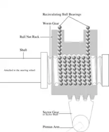 The worm gear is similar in design to a ball screw; the threads are filled with steel balls that recirculate through the gear and rack as it turns. The balls serve to reduce friction and wear in the gear, and reduce slop. Slop, when the gears come out of contact with each other, would be felt when changing the direction of the steering wheel, causing the wheel to feel loose.[2]
