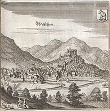 The name “Wolfstein” has appeared in many different spellings over the ages: Woluisstein (1275), Wolffestein (1387), Wolffstein (1438), Wolfsstein (1477), Wolfstein (1824). Also, in the local dialectal speech, the town is called Wolschde.