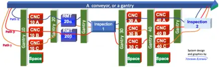 The components of RMS are CNC machines,[10] reconfigurable machine tools,[6][8] reconfigurable inspection machines[11] and material transport systems (such as gantries and conveyors) that connect the machines to form the system. Different arrangements and configurations of these machines will affect the system's productivity.[12] A collection of mathematical tools, which are defined as the RMS science base, may be utilized to maximize system productivity with the smallest possible number of machines.