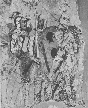 Although the crusaders were hoping for assistance from John V Palaiologos, Byzantine Emperor, the pope had made it dependent on his bringing the Greek Orthodox Church back into communion with the Roman Catholic Church—and under papal supremacy—even though it was the Byzantine empire that the crusade was seeking to relieve from Turkish pressure.[19] The crusaders also expected support from Louis of Hungary, although all that was ever received was two royal squire who served Amadeus "in the Bulgarian provinces" (in partibus Burgarie).[20] In the spring of 1366, John V travelled to the Hungarian court to accept military aid and swear an oath on behalf of himself and his sons to convert to Catholicism. On 1 July Pope Urban had extended to Louis the Crusade indulgence, but on 22 July a letter from the pope suspended the privileges granted earlier that month for one year, postponing assistance to the Greeks until after their return to the Catholic fold and convincing Louis not to assist the "schismatic", although the pope had not expressly forbid him to.[19][21] On his return through Bulgaria, so recently attacked by his would-be ally, John found himself trapped, either imprisoned or surrounded by Bulgarian forces, and unable to continue to his own domain, where his son, Andronicus IV, married to Keratsa, daughter of the Bulgarian tsar, had taken control of the government. Amadeus and John V were first cousins, John's mother, Anna, was the sister of Amadeus's father, Aymon.[19]