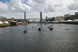 The Pont de Recouvrance (French pronunciation: [pɔ̃ də ʁəkuvʁɑ̃s]) is a vertical-lift bridge in Brest, France, across the river Penfeld. Opened on 17 July 1954, it was the largest vertical-lift bridge in Europe until the opening of the Rouen Pont Gustave-Flaubert in 2008. It links the bottom of the rue de Siam to the quartier de Recouvrance, replacing a swing bridge (the pont National) destroyed by Allied bombardment in 1944.