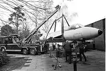 It is not uncommon to use a second winch from the opposite side, to gently lower the casualty once it has passed the point of balance. It is also quite common for recovery operators to be asked to move 'other' items. The picture at right, taken in the late eighties, shows a recovery crane lifting a Hawker Hunter aircraft before transporting it to Brooklands Museum in Weybridge, England.