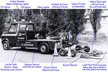 Now rarely used, but for many years the only way to move a disabled vehicle without using a low loader or trailer. Chains were attached, usually around the casualty's suspension, and some form of packing (often a seat squab or tyre) was inserted between the lifting frame and the casualty. This frame was lifted by means of a pulley until the casualty’s wheels were clear of the ground. An 'A' frame was normally used to keep the casualty from running into the tow vehicle on braking.