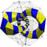 A related vertex-transitive polytope can be constructed with equal edge lengths removes 120 vertices from the rectified 600-cell, but isn't uniform because it contains square pyramid cells,[1] discovered by George Olshevsky, calling it a swirlprismatodiminished rectified hexacosichoron, with 840 cells (600 square pyramids, 120 pentagonal prisms, and 120 pentagonal antiprisms), 2640 faces (1800 triangles, 600 square, and 240 pentagons), 2400 edges, and 600 vertices. It has a chiral bi-diminished pentagonal prism vertex figure.