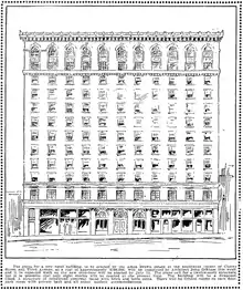 In 1911, Brown's estate under the direction of his son Alson L. Brown commissioned architect John Graham, Sr. (whose offices were located in the recently completed Lyon Building next door) to design a fireproof hotel building for their lot. They had Graham make plans for both an 8-floor and 12-floor design that they would decide upon if the bids for the larger design met their budget or not. Graham's design was for a 3-part Beaux-Arts tower faced with limestone, brick and terra cotta over a reinforced concrete structure.[9] They ultimately opted for the 12-floor design, costing an estimated $200,000, but chose to only complete the first 6 floors for the time being. Graham's concept sketch was published in the July 9, 1911 edition of the Seattle Times, showing the building as it would have been with the top 2 floors forming the capital of the 3-part design with arched windows and a large dentiled cornice.[10] Demolition of the old buildings by contractor S.G. Combs[8] began in July 1911[7] and excavation of the lot was completed by the end of August.[11] Harry Brandt was awarded the general contract[12] and the building's steel and concrete structure was finished by the end of the year.[13] Although the building was completed by early 1912, the hotel itself wouldn't open for another year; the reason for this delay was never made clear. The Hotel Rector, operated by the Levinson Hotel Company, Inc., officially opened on May 5, 1913, touting its fireproof building and the fact that it was completely furnished by Seattle labor. Doc Humphrey, previously of the Frye Hotel, was its first manager.[14] A large neon sign spanning the building's top 5 floors could be seen up and down Cherry Street.