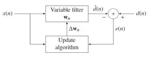 where represents additive noise. The intent of the RLS filter is to recover the desired signal by use of a -tap FIR filter, :