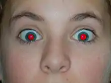 The red-eye effect in photography is the common appearance of red pupils in color photographs of the eyes of humans and several other animals. It occurs when using a photographic flash that is very close to the camera lens (as with most compact cameras) in ambient low light.