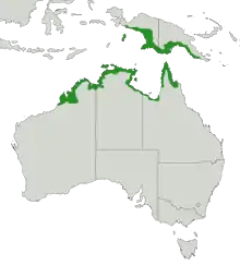 The nominate subspecies of the red-headed myzomela is distributed across the tropical coastlines of Western Australia, the Northern Territory and Queensland. It inhabits coastal areas of the Kimberley and various offshore islands in Western Australia, and is similarly distributed in the Northern Territory, including Melville Island and the Sir Edward Pellew Group of Islands. It is widespread around the coast of the Gulf of Carpentaria and the Cape York Peninsula.[18] M. e. infuscata occurs at scattered sites in West Papua and in south Papua New Guinea, from the Mimika Regency in the west to the Fly River in the east, and the Aru Islands.[19] Some birds of Cape York have features intermediate between the two subspecies.[8]