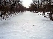 The river is popular in the summer for canoeing and kayaking. (The campus canoe dock is self-mockingly named Red Cedar Yacht Club.)[21] During floods, the river forms a standing wave at the campus dam that can be surfed.[22][23] In the winter, the river often freezes over and students walk or play on the ice despite the inherent danger.[24] During its inaugural season in 1922, the MSU hockey team played games on the frozen river.[25]