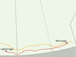 In Saskatchewan, Highway 13 is designated as Red Coat Trail. The travel corridor from the Manitoba–Saskatchewan border to Winnipeg follows Manitoba PTH 2.[nb 1][1]