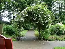The garden has been designed with lawns, scented old climbing roses, an arbour and borders containing old-fashioned flowers to reflect 19th-century taste.[3] It contains a display of old gateposts on the lawn.