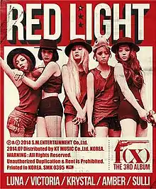 Red Light is the third studio album by South Korean girl group f(x), released on July 7, 2014, by SM Entertainment and Genie Music. It reached number one on the Gaon Album Chart[4] and had two promotional singles, "Red Light" and "Milk". This is the last album with Sulli, who left the group one year after its release.