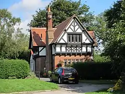 Red Lodge has an irregular cruciform plan and is in Tudor Revival style. It is in two storeys, the lower storey being in sandstone, and the upper storey in timber framing and painted brick. The house has a red-tiled roof, and each front has a gabled and jettied upper floor. The entrance is on the east side, and has a porch with a lean-to tiled roof. The windows are mullioned. There are two chimney stacks, the one to the west containing a decorative panel with the initials "R. B." and the date 1870.[1]