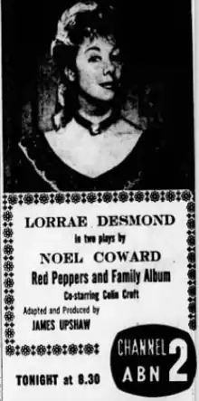 It was Desmond's debut in a straight stage production and followed airing of her own variety show, The Lorrae Desmond Show. She had been in the US. Her co star Colin Croft appeared on her variety show.[2]