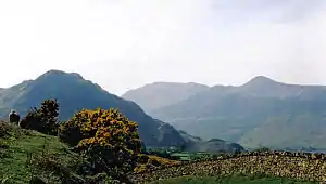 The Buttermere Fells, also known as Buttermere Edge,[2] form the watershed between Buttermere and Upper Ennerdale. The Ennerdale flanks are steep and rough with areas of crag, the lower slopes being planted with a ribbon of conifers. Across the narrow ridge-top to the north are deep corries and dark walls of crag, glowering down over the lake. The ridge continues south east to Haystacks and the Great Gable group. Beyond Red Pike to the west are Starling Dodd, Great Borne and the Loweswater Fells.