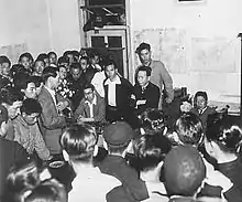 Japanese workers strongly opposed the austerity policies of Dodge and Yoshida and had been continuously opposing them through strikes, wildcat strikes, and protests since March 1949.[69] In April, at the instigation of MacArthur, Yoshida issued the Ordinance for Controlling Associations and Others to "facilitate [the] healthy development of pacifism and democracy", to prohibit "militaristic, ultra-nationalistic, violent, and antidemocratic" groups, and to require each political organization to register its name, membership, purpose and activities.[70] JCP registered over 100,000 members, which later helped the government locate communists.[70] In June, communist leaders announced that a "September Revolution" would be launched. In the same month, Taira and some other cities were occupied by 500 workers.[71]