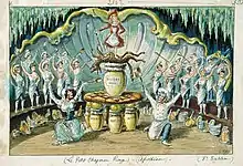 In the village square, a fête is in progress. Red Riding Hood's rescue procession comes back just in time to watch the great parade of village worthies, peasants, and schoolchildren through the square. The wolf's body is ceremoniously put on a spit and roasted. A spectacular apotheosis shows Red Riding Hood, in the pose of Saint Michael Fighting the Dragon, skewering her enemy on a pedestal of enormous galettes and butter pots, surrounded by baking and cooking implements.[1]