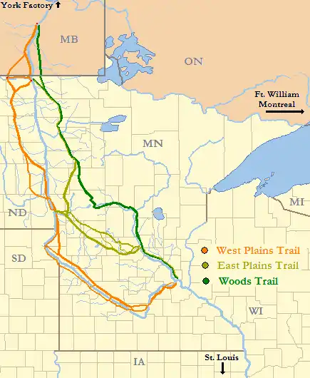 The West Plains Trail, although relatively level, went by a lengthy route through the lands of the Dakota people, and the shorter East Plains Trail also skirted Dakota land. The Dakota were the enemy of the Ojibwa, to whom the Métis carters were related by blood and marriage.[35] These tensions led to conflicts. One such bloody confrontation in the summer of 1844 (caused by an attack by Métis carters on Dakota hunters) occurred when that year's expedition of free traders were in Saint Paul. This meant that they could not safely return by the normal route.[36] The traders therefore struck northwest up the Mississippi to Crow Wing at the mouth of the Crow Wing River, west up that river and across the height of land to the fur post at Otter Tail Lake, then northwest across the prairie to a crossing of the Red River near its confluence with the Forest River.[37] The next year, a southbound party followed its tracks, and by the year after (1846), the final route had been well-established inland from the Red River bottomlands. This trail was known as the Woods or Crow Wing Trail; it was also known locally as the Saint Paul Trail and Pembina Trail.[38]
