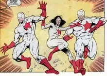 Red Trinity came into conflict with Blue Trinity after they helped Wally West (Flash) smuggle Doctor Orloff out of Russia, because his expertise was needed to save the life of Doctor Jerry McGee (Speed Demon) in America.[1] Flash and Red Trinity fight and defeat Blue Trinity at the Finnish border.[2] As a result of their trip, Red Trinity decided to make the United States their home. They started up a super-powered intercontinental messenger service called "Kapitalist Kourier Service, Inc."[3]