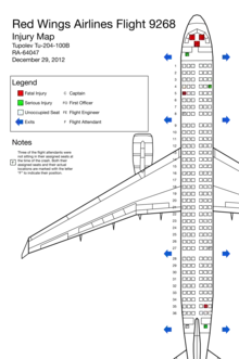 Red Wings Airlines Flight 9268 was a Tupolev Tu-204-100 passenger jet that on 29 December 2012 crashed on landing at Moscow Vnukovo Airport, Russia, following a repositioning flight from Pardubice Airport, Czech Republic. There were no passengers on board, but 5 of the 8 crew members were killed when the aircraft hit a ditch and highway structures after overrunning the runway.[1]