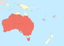 The red and blue damsel is widespread across all Australian states,[9] as well as Fiji, New Caledonia, and other islands in the Pacific.[10] It is found in north and eastern Tasmania. It is typically found near dams, marshes and slow watercourses.[9]