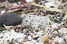 The red-capped plover is a seasonal breeder on the coasts of Australia, but breeds in response to unpredictable rains inland.[3] The plover nests on the ground close to wetlands; the nest is a small depression in the ground, with minimal or no lining. The clutch of two pale yellowish-brown eggs are speckled with black spots. The Incubation period is 30 days; incubating is mainly done by the female. Upon hatching, the young are open-eyed, mobile, and relatively mature (precocial); they flee the nest shortly after birth (nidifugous).