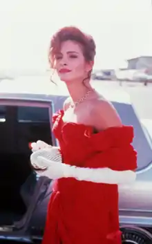 In Pretty Woman, Roberts portrays Vivian Ward, a Hollywood Boulevard prostitute who entertains older businessman Edward Lewis (Richard Gere) and subsequently falls in love with him.[1][4] Vance utilized her style portray to character's evolution in the film as her fashion becomes more polished and minimalist, inspired by Edward.[1] The dress was designed to be "diametrically opposite" to her revealing outfits at the beginning of the film.[1] The gown is worn during a "pivotal transformation" sequence which presents [Vivian] as a "real lady" prior to an evening at the opera.[1][9] The scene where Roberts wears the gown has been referred to as cinematically significant and an "all-time movie moment", featuring improvisation intended by Gere for the film's gag reel. In the film, Edward surprises Vivian by snapping a necklace case on her fingers, with Roberts letting out a "yelping" and "iconic" laugh.[10][11][12] Marshall later referred to it as "the trademark for the movie".[12]