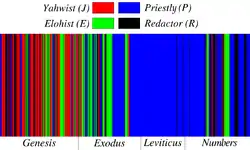 Friedman's distribution of materials by source of the first four books of the Hebrew Bible, including a redactor (black), according to the documentary hypothesis.[1][2]