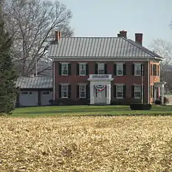 Constructed in 1858,[1] Redlands was originally the home of one of Pickaway County's more prosperous farmers, Jacob Valentine. The farmhouse itself is a brick structure, built of bricks manufactured on the farm;[2] its foundation and minor elements are stone, and additional buildings on the property are weatherboarded.[3] Its construction and its numerous decorative elements combine to make it typical of estates built for wealthy southern Ohio landowners soon before the Civil War. Particularly significant among these elements are the Greek Revival front porch, transoms above the windows and doors, its prominent fireplaces, and its grand front stairway.[2]