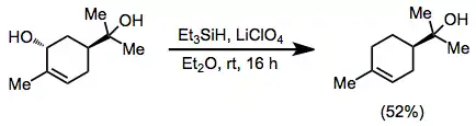 - Wustrow, David J.; Smith, William J.; Wise, Lawrence D. (January 1994). "Selective deoxygenation of allylic alcohols and acetates by lithium perchlorate promoted triethylsilane reduction". Tetrahedron Letters. 35 (1): 61–64. doi:10.1016/0040-4039(94)88162-6.