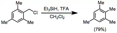 Reductions with hydrosilanes are methods used for hydrogenation and hydrogenolysis of organic compounds. The approach is a subset of ionic hydrogenation. In this particular method, the substrate is treated with a hydrosilane and auxiliary reagent, often a strong acid, resulting in formal transfer of hydride from silicon to carbon.[1] This style of reduction with hydrosilanes enjoys diverse if specialized applications.
