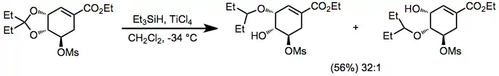 Acetals, ketals, and aminals are reduced in the presence of hydrosilanes and acid. Site-selective reduction of acetals and ketals whose oxygens are inequivalent have been reported—the example below is used in a synthesis of Tamiflu.[18]