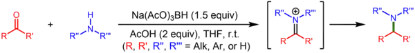 In a separate approach, imine formation and reduction can occur sequentially in one pot. This approach, known as direct reductive amination (Borch reaction), employs reducing agents that only react slowly (or not at all) with the ketone/aldehyde precursors. These hydride reagents also must tolerate moderately acidic conditions. Typical reagents that meet these criteria include sodium cyanoborohydride (NaBH3CN) and sodium triacetoxyborohydride (NaBH(OCOCH3)3).[3] These reactions are generally conducted at pH ~ 5, typically using a weak acid (e.g., acetic acid) as a catalyst. Under these conditions, the reaction of the carbonyl and amine results in formation of a small amount of the iminium ion (R1R2C=N+R3R4), which is reduced much more readily than the carbonyl starting material. As a result, the selective reduction of the iminium takes place to give the amine (rather than direct reduction of the carbonyl to form the alcohol).[4]