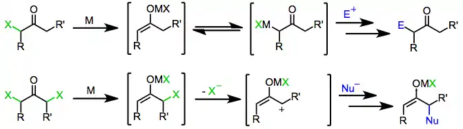 In organic chemistry, α-halo ketones can be reduced with loss of the halogen atom to form enolates. The α-halo ketones are readily prepared from ketones by various ketone halogenation reactions, and the products are reactive intermediates that can be used for a variety of other chemical reactions.