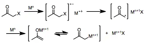 One-electron reducing agents, such as d6 or d1 transition metal complexes, initially donate a single electron to the halo ketone. Fragmentation of the resulting radical anion yields an organic radical and halide anion. Donation of a second electron from a second equivalent of reducing agent leads to the formation of a metal enolate in which the oxidation state of the reducing agent has increased by one.[6]