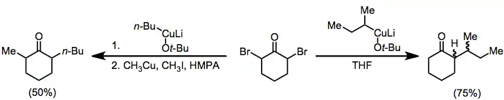 Organocuprates may also be employed for the reduction of α,α'-dihalo ketones to alkylated ketones. In the absence of an electrophile the monoalkyl ketone is isolated in good yield;[18] when an alkyl iodide is added, the dialkyl ketone is isolated (geminal alkylation is a problematic side reaction).[19]