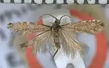 Male. โ 9 mm. Head, palpi, and antennae light fuscous ; palpi moderate ; antennal ciliations 2+1โ2. Thorax fuscous. Abdomen grey. Legs grey-whitish. Forewings elongate, costa slightly arched, apex rounded, hindmargin extremely obliquely rounded ; rather dark fuscous, irrorated with very obscure grey-whitish spots ; costa with four more distinct small white spots on posterior half: cilia whitish-fuscous, basal half except towards anal angle fuscous obscurely spotted with whitish. Hindwings light grey ; cilia 1+1โ2, grey-whitish.[4]