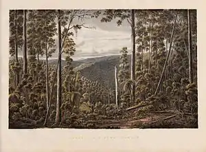 There has always been a recognition of the conservation and aesthetic values of Victoria's large forest trees.[7] As early as 1866, Ferdinand von Mueller, the Government botanist, published some astonishing, and probably exaggerated claims of a mountain ash (Eucalyptus regnans - monarch of the eucalypts) on the Black's Spur near Healesville being 146.3 metres (480 feet) high. There were reports from nurseryman David Boyle[8] and others, of trees in the Yarra Valley, Otways and Dandenong Ranges reaching "half a thousand feet" (500 m).[9] In 1856, on an overland trip across the Otways Ranges from Forrest to Apollo Bay, Edward Snell, civil engineer and surveyor, made one of the earliest reports of hundreds of trees at least 120 metres (390 feet) tall.[1][10] The tallest reliably measured tree in Victoria was a mountain ash near Thorpdale which, after it was cut down to make fence palings in 1881, was measured at 114.3 metres (375 feet) by a government surveyor, George Cornthwaite, and his brother Bill, a farmer.
