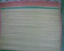 In the Philippines, woven reed mats are called banig. They are used as sleeping mats or floor mats, and were also historically used as sails. They come in many different weaving styles and typically have colorful geometric patterns unique to the ethnic group that created them. They are made from buri palm leaves, pandan leaves, rattan, or various kinds of native reeds known by local names like tikog, sesed (Fimbristykis miliacea), rono, or bamban.[3][4]