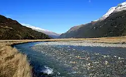 The Rees River (Māori language: Puahiri or Puahere)[1] is a headwater tributary of the Clutha River / Mata-Au that drains eastward of the main divide of the Southern Alps / Kā Tiritiri o te Moana in New Zealand. The river runs 41 km,[2] drains an area of 406 km2, and discharges into the head of Lake Wakatipu at Glenorchy. Bound by the Richardson (Whakaari) Mountains[3] to the east and the Forbes Mountains[4] to the west, its snow-covered headwaters rise above 2000 m.